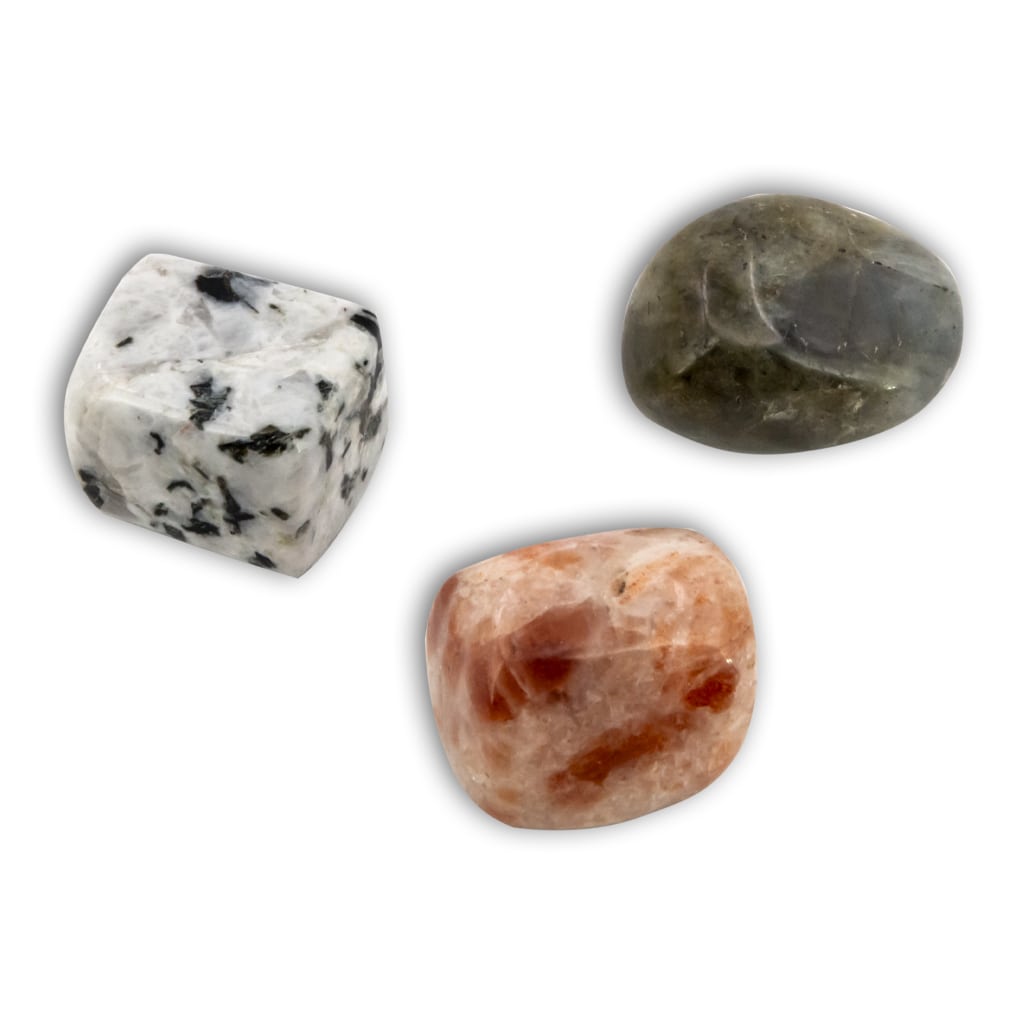 Combinando la sensibilidad de la Piedra Luna, la intuición de la Labradorita y la energía vibrante de la Piedra Sol, este trío de cristales trabaja para creer en tí mismo.