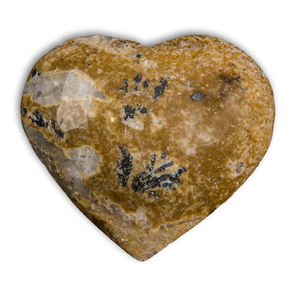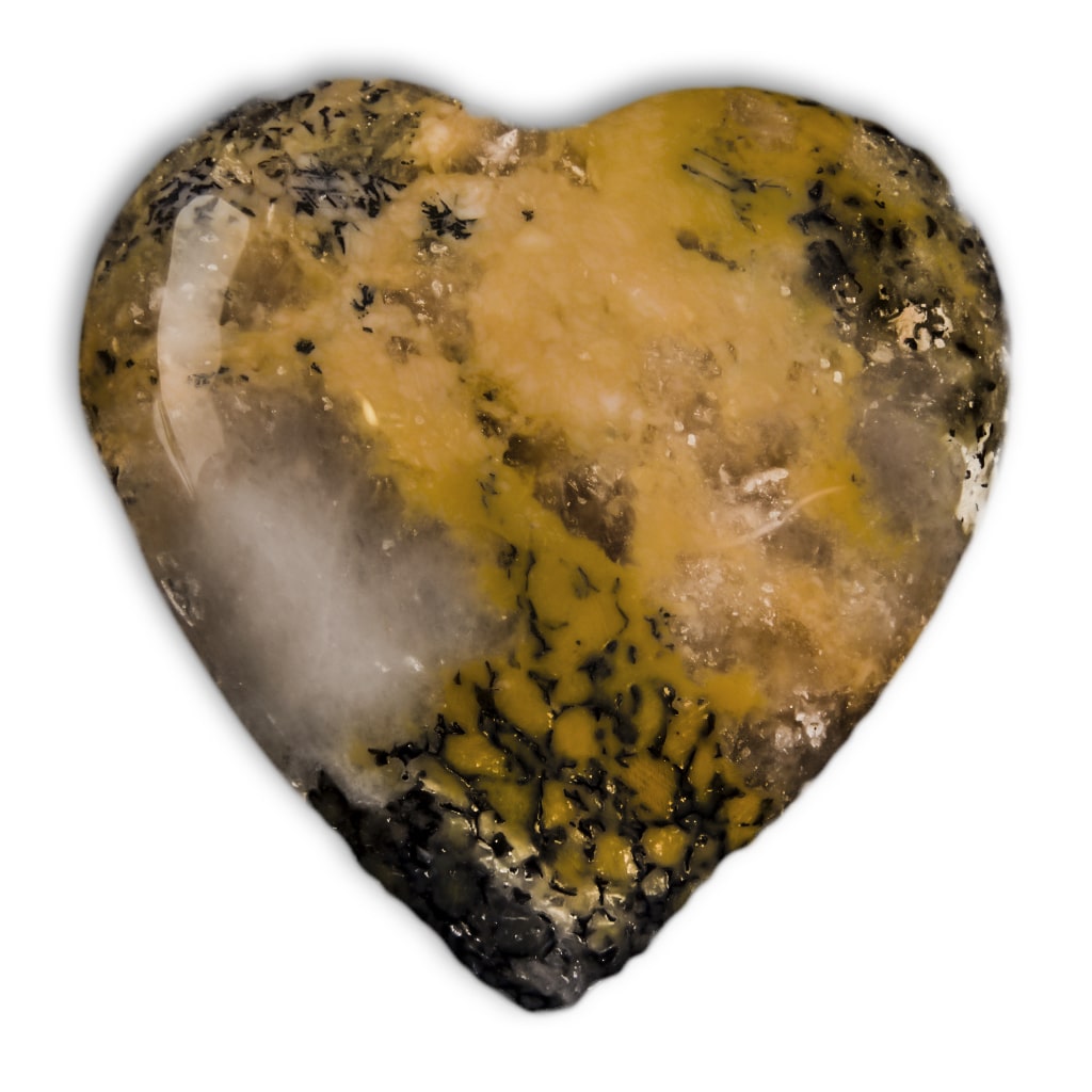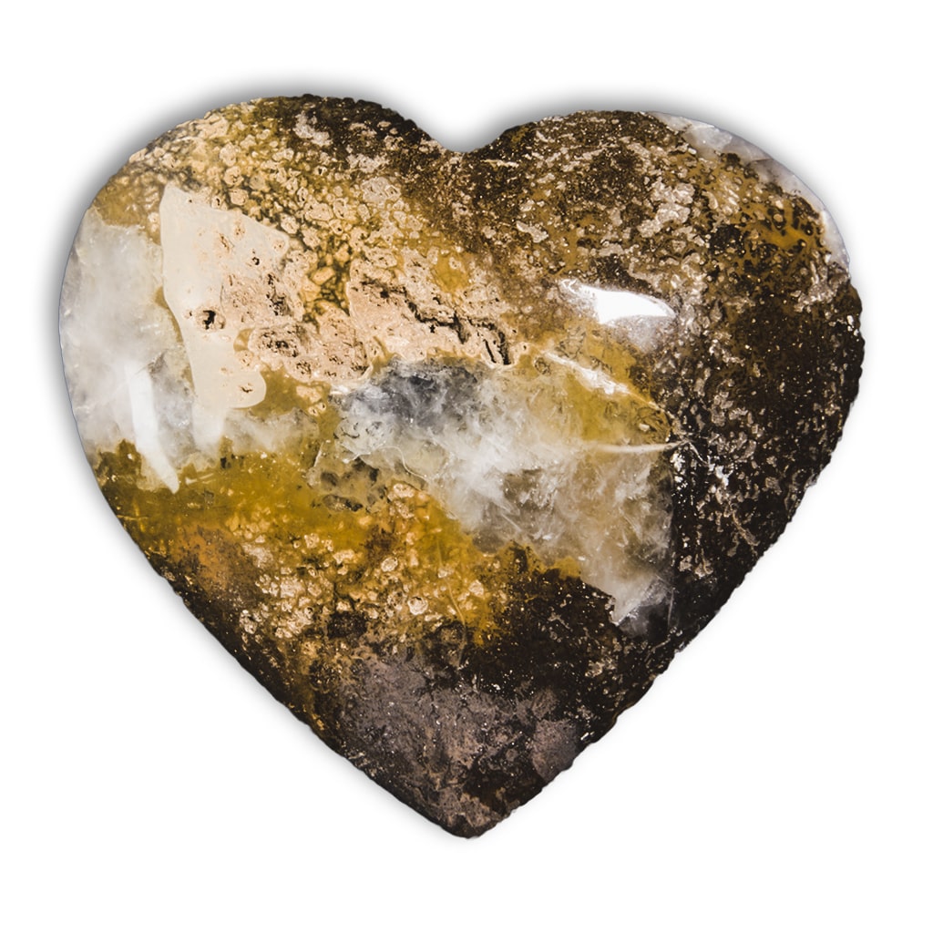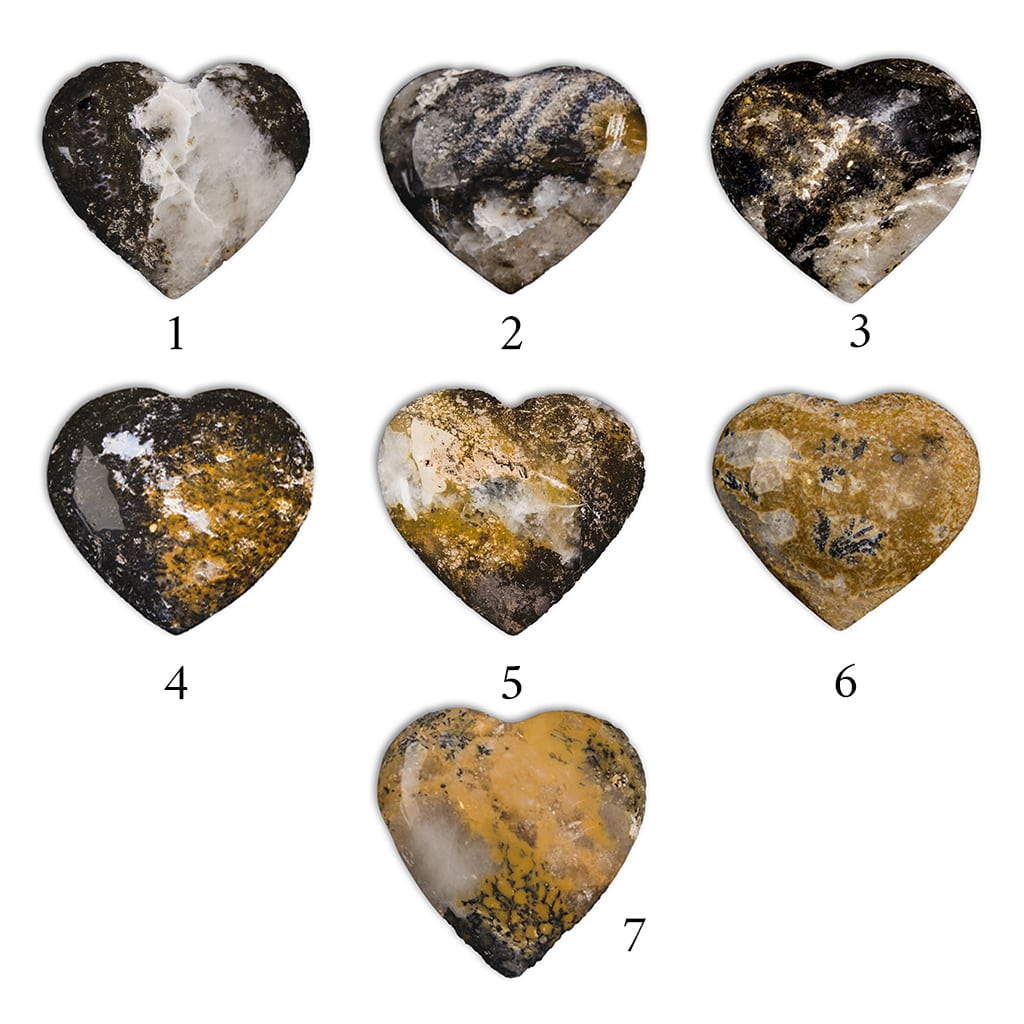 Precious natural Moss Agate or Mossy hearts with various drawings.