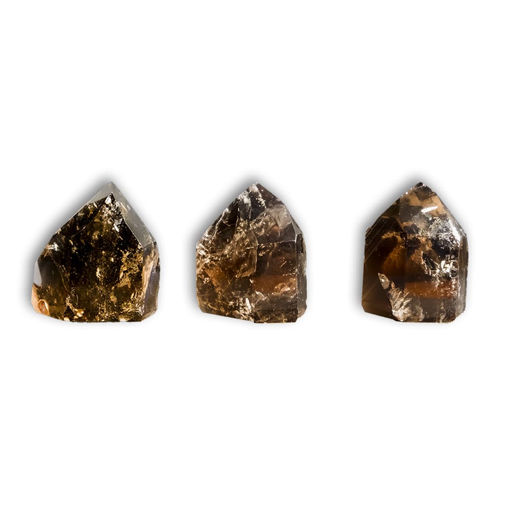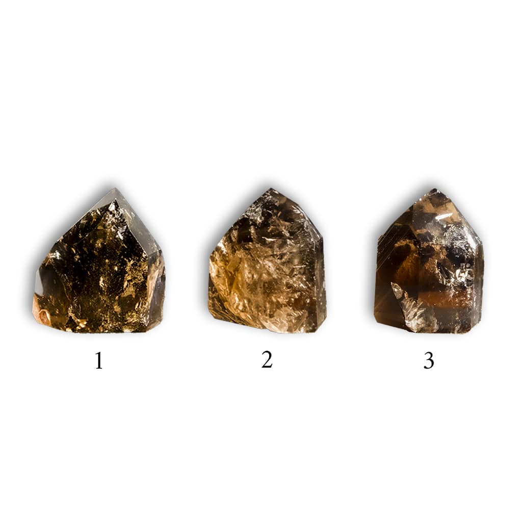 Smoky Quartz point carved with flat base. Since they are natural minerals, some of them have veins and inclusions both internal and external.