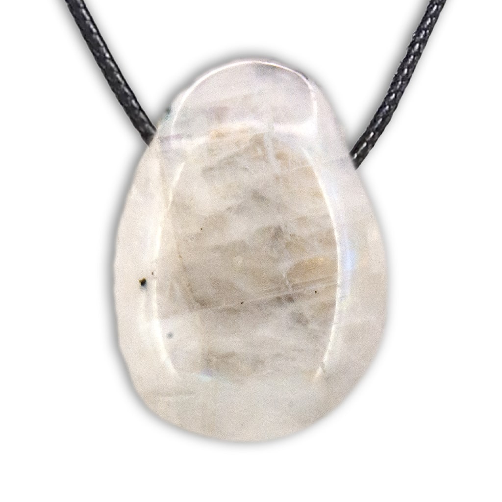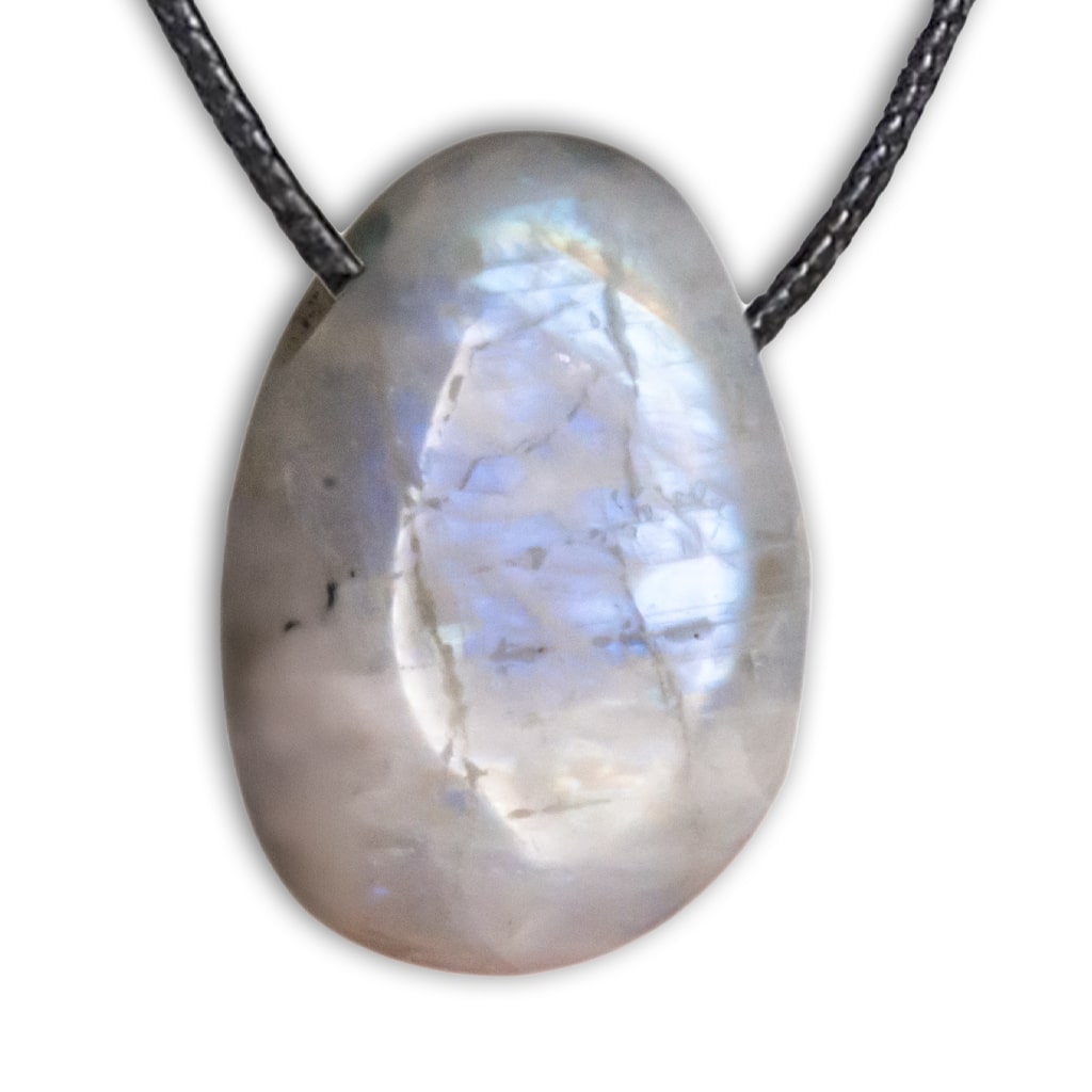 Colgante de Piedra Luna en forma de rodado con destellos iridiscentes azules propios del mineral. Tiene una perforación para poner el hilo o cuero que se desee.