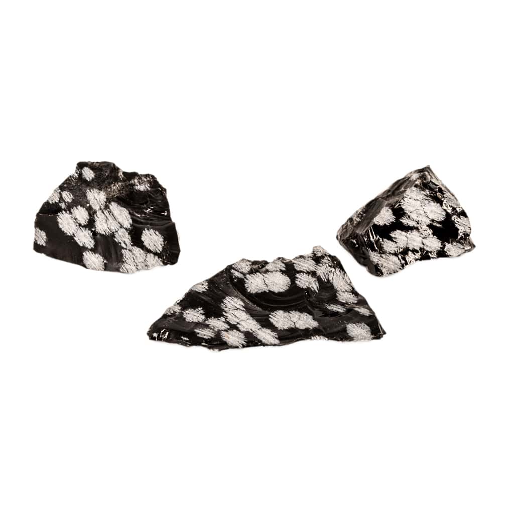 Trozos naturales de Obsidiana de color negro con manchas circulares blancas llamadas esferulitas. A este mineral también se le conoce como "Obsidiana Copo de Nieve".