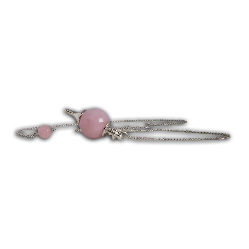 Péndulo de Cuarzo Rosa redondo con cadena con bolita de Cuarzo Rosa en su extremo.