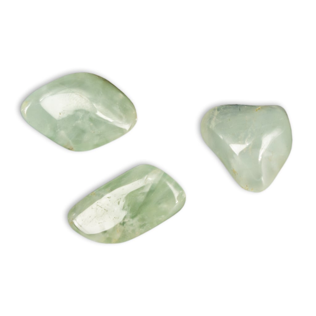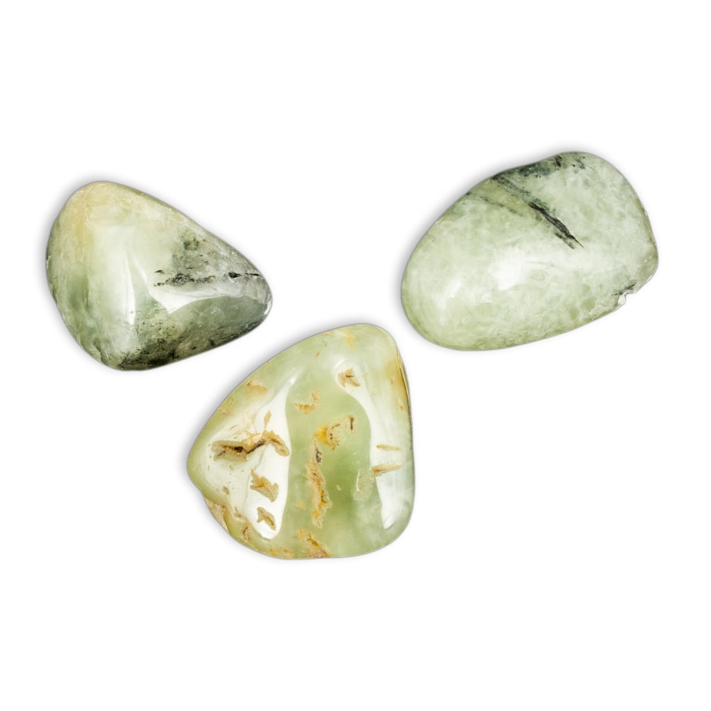 Rodado de Prehnita de color verde claro con vetas mas oscuras.