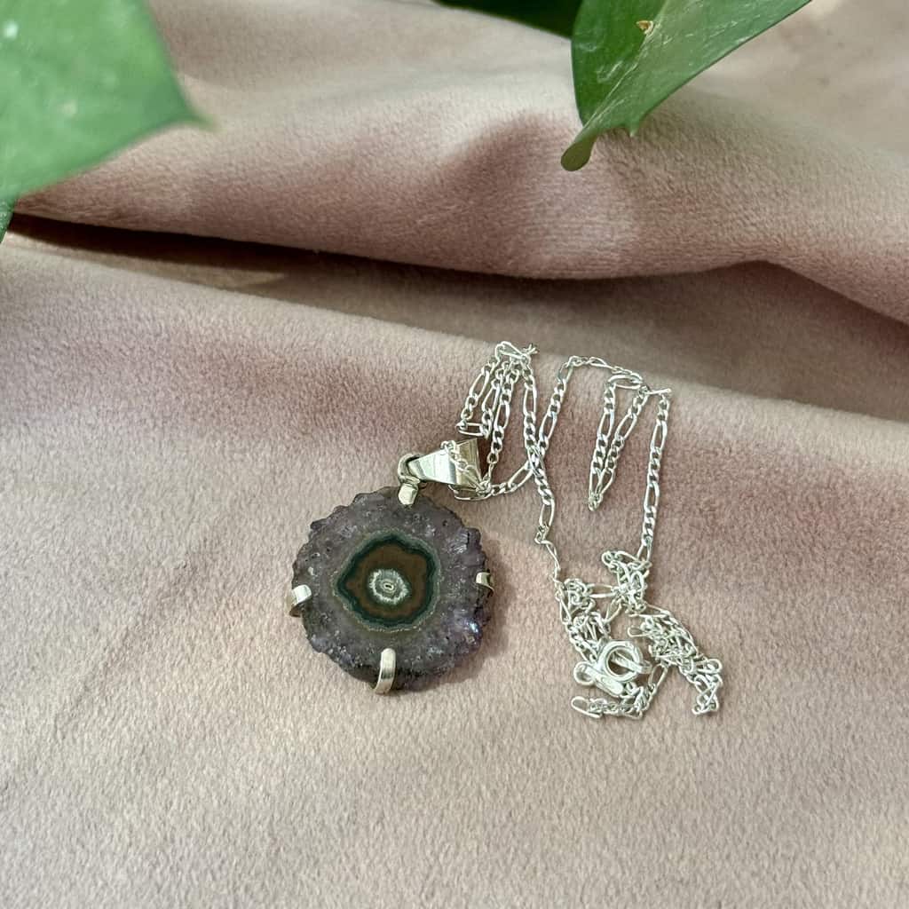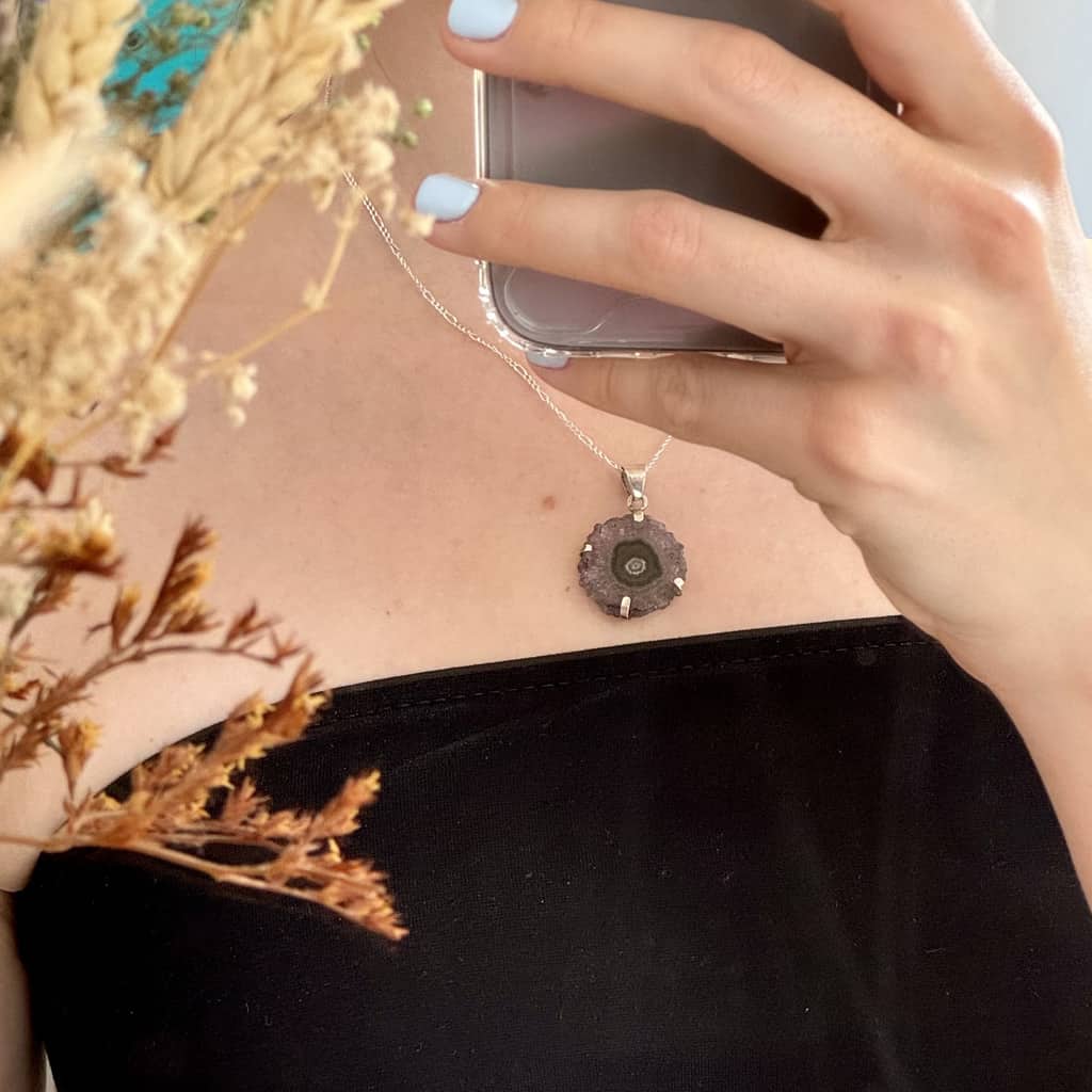 Uma peça seleta e fina. O pingente é uma estalactite de ametista cortada em forma de fatia e montada com lindas garras em prata de lei 925 .