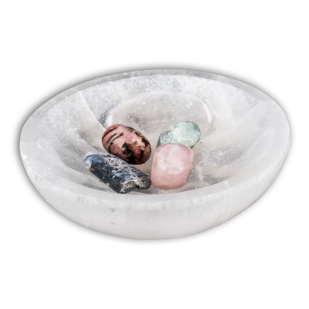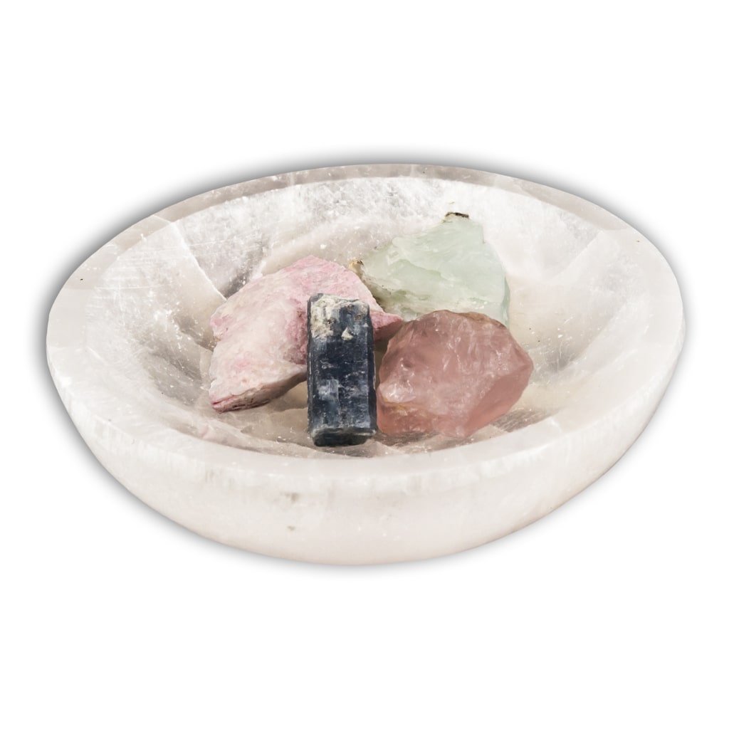 O pack inclui Selenite , Geodo de Quartzo Branco, Calcite Azul e um saco de juta para transporte.