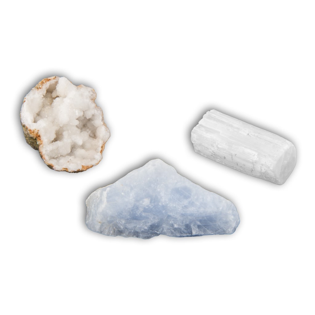 O pack inclui Selenite , Geodo de Quartzo Branco, Calcite Azul e um saco de juta para transporte.