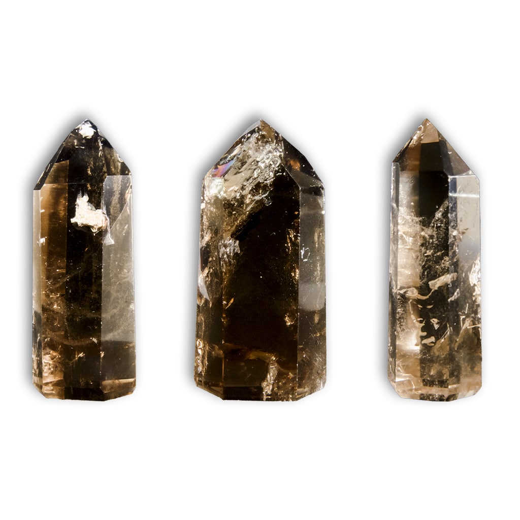 Ponta de Quartzo Fumê esculpida com base plana. Por serem minerais naturais, alguns deles apresentam veios e inclusões tanto internas quanto externas.