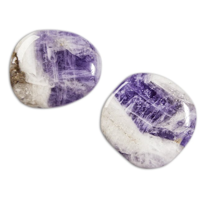 Pedrinhas arredondadas de ametista com faixas polidas em formato oval.